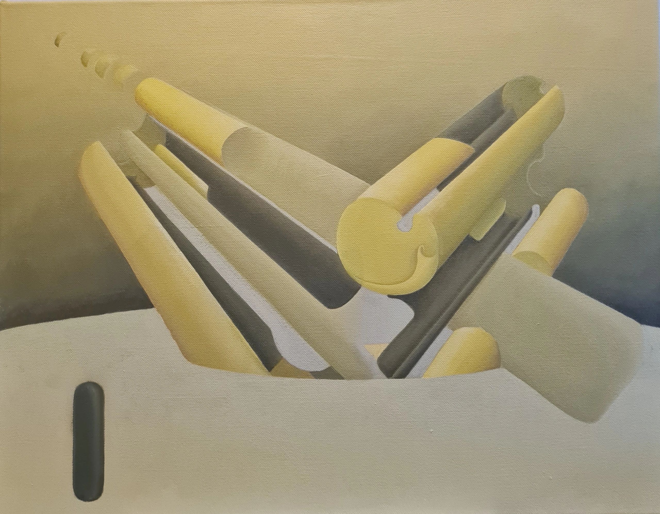 "Værket undersøger, hvordan farverum kan opbygges gennem lag, transparens og perspektiviske forskydninger. Forskudte planer og brudte geometrier skaber en dynamisk vekselvirkning mellem dybde og overflade."